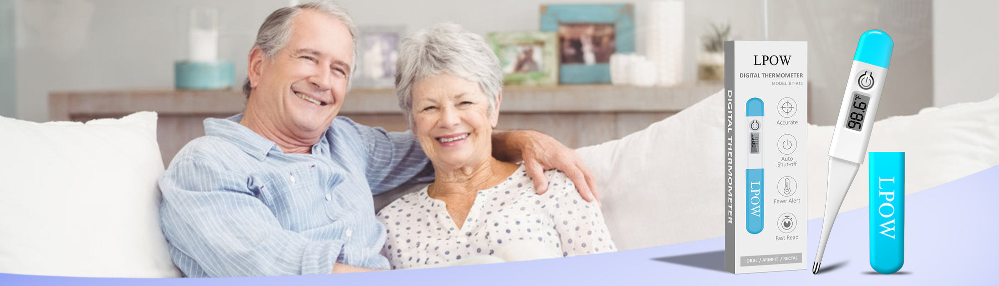 LPOW thermometer comes with a cover to keep the thermometer away from pollution, you can put it in a shoulder bag or trouser pocket and carry it with you.So you can confirm that you are healthy at any time. How to take your temperature by use the degital thermometer? 1. Press ON/OFF button to activate. The unit would beep and LCD display test will go on for around 2 seconds. 2. Then, the temperature taken last time would be displayed with a “M” mark in the right corner. 3. Then, 98.6˚F will appear. 4. When Lo and flashing ˚F displays, the thermometer is ready for temperature measuring. But if the room temperature is higher than 89.6˚F, the room temperature would be displayed instead of Lo. 5. The beep will sound when temperature measuring is complete. 6. Press ON/OFF button to turn off the unit. (The unit will automatically power off...